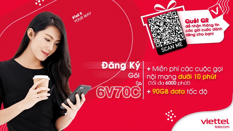 Đăng ký 6V70C của Viettel chỉ với 420.000đ cho 180 ngày sử dụng. Bạn được gọi miễn phí tất cả các cuộc gọi nội mạng Viettel có thời lượng dưới 10 phút. Tối đa không quá 6000 phút trong 180 ngày. Và miễn phí 90Gb data 4g tốc độ cao, mỗi ngày sử dụng 500mb data, hết 500mb data/ ngày hệ thống ngắt kết nối mạng ngày hôm sau sử dụng tiếp.